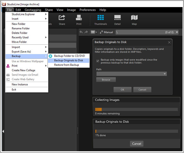 In regular intervals, in particular after having loaded or updated a large set of images in StudioLine, you should always perform an incremental backup of your entire StudioLine image archive. This will enable you to load your images into other software, if ever StudioLine should fail to start.